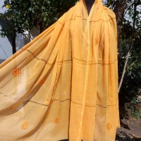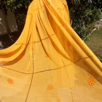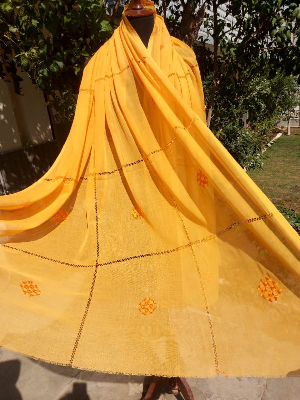 Description: A delicately embroidered scarf made by an Afghan refugee artisan. In Tarkashi, the thread is removed from the fabric and decorative stitches are formed over the remaining thread.
