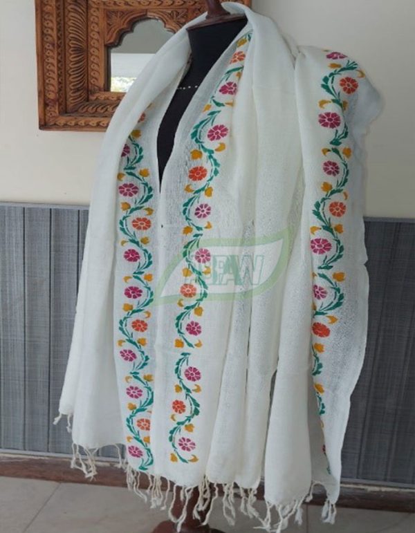 A unique and specially designed stencil is used to paint flowers on the borders of the entire shawl.