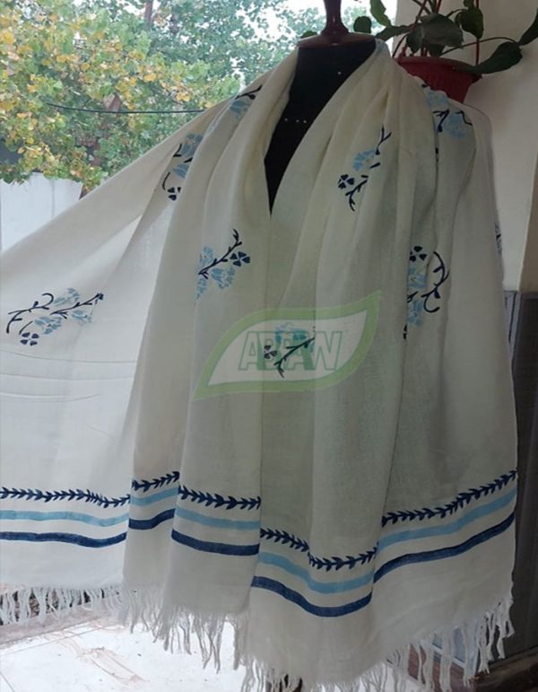 A unique and specially designed stencil is used to paint flowers as a repeat motif with equal spacing. The borders are decorated with horizontal blue straight & arrowed lines.
