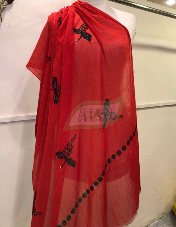 A unique and specially designed stencil is used to paint black flying Cranes all over the borders of the stole with black small circles on the border.