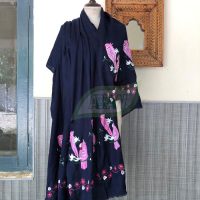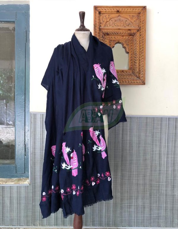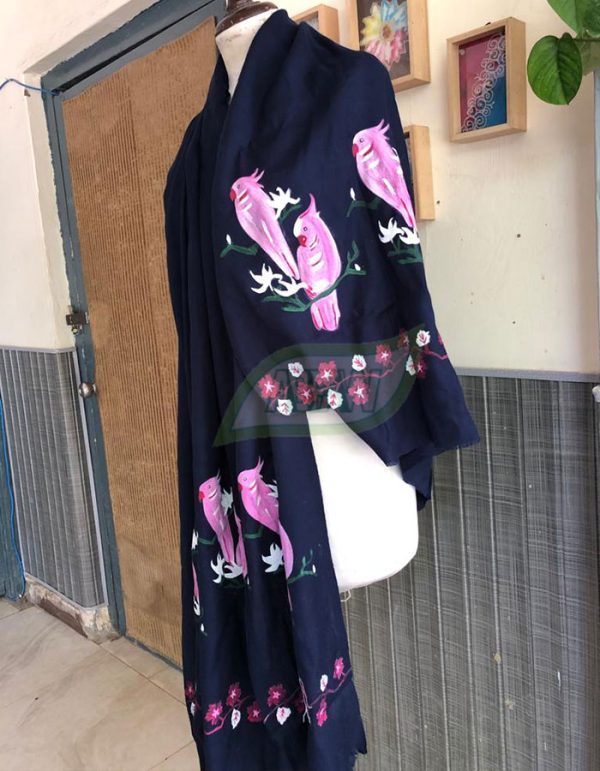 A unique and specially designed stencil is used to paint colorful small birds on the borders of the stole. The colorful bird motif is repeated in a grid format with equal spacing.