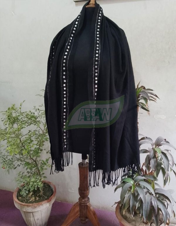 By twisting thin silver metallic, fardi (dots) are adorned on the borders of the stole. Very small dots surround small dots in horizontal lines.