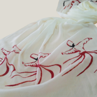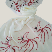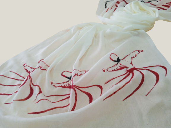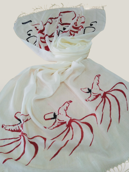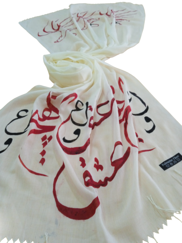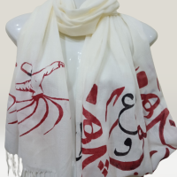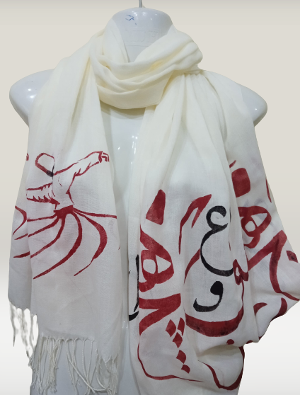 Description: Three unique and specially designed stencils are used to paint whirling Darvaish, Ishq (Love), and, Heech (Nothingness). For a twist, three more stencils of Ain ( ع ) Alif ( أ ), and Wao ( و ) are used on the borders of the stole.