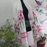 Two unique and specially designed stencils – Tulips and Butterflies – are used to paint the motif on the Shawl. The borders are adorned with lines.